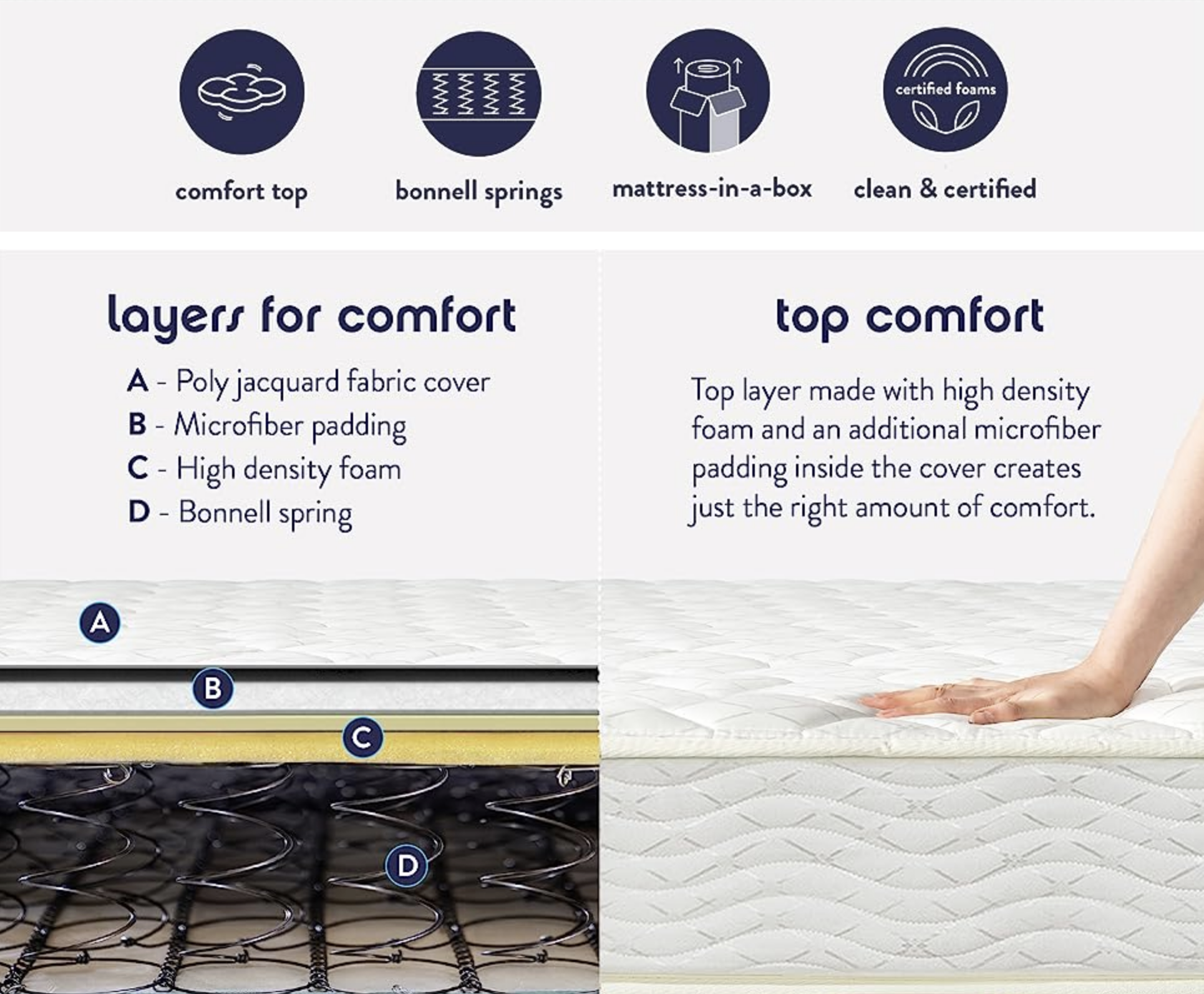 Comfort Series 8″ Spring Mattress — medium firm, durable Bonnell spring support, hypoallergenic, 5-year warranty.