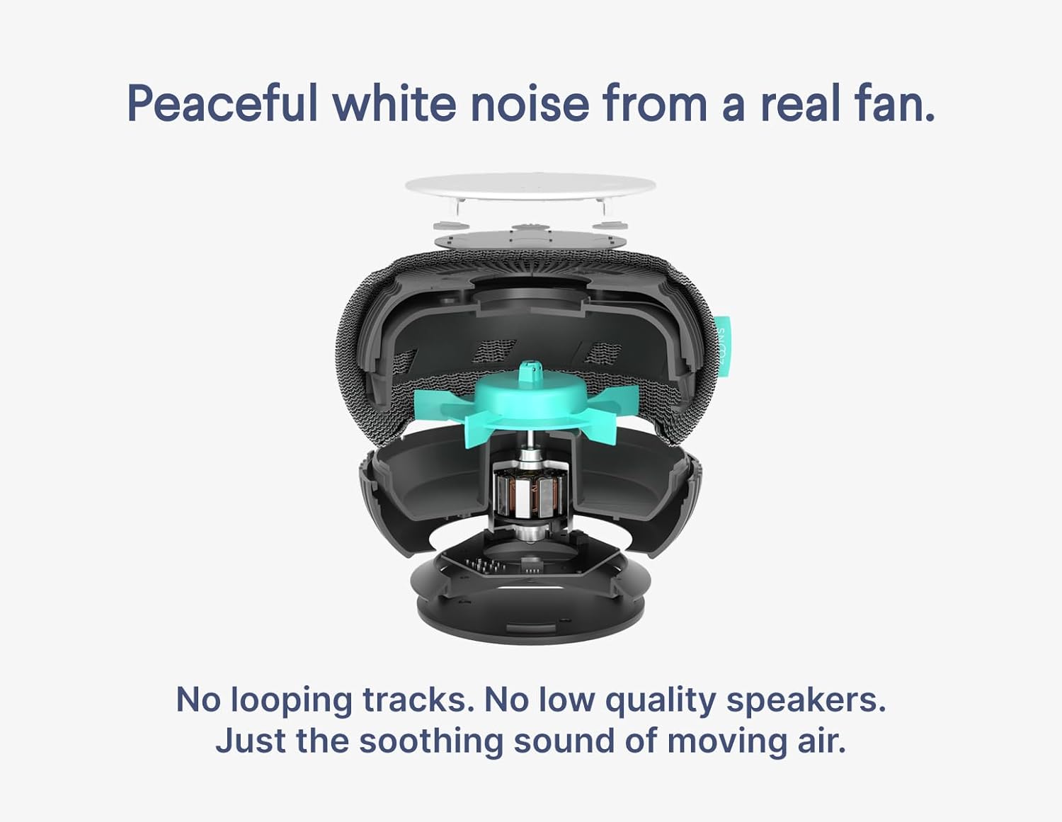 Real fan inside for natural, non-looping white noise. Sleep aid for adults, kids, babies, and travel.
